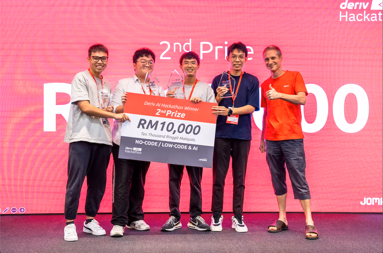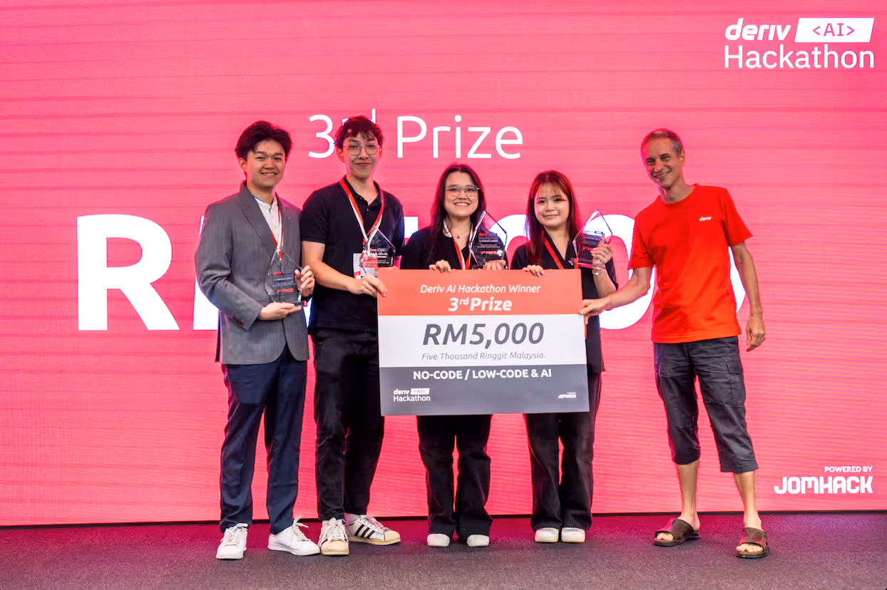 At the start of November, Deriv's headquarters in Cyberjaya transformed into an innovation hub as we hosted our inaugural AI Hackathon. The event, powered by JomHack Labs, a leading hackathon organiser, brought together Malaysia's brightest minds to tackle real-world trading challenges using AI, low-code, and no-code solutions. The response exceeded our expectations: